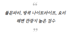 태국은 풀문파티(Full Moon Party), 방콕의 나이트라이프, 세계적으로 인정받은 요리문화, 해변 관광지 등에서 높은 점수를 받았다.