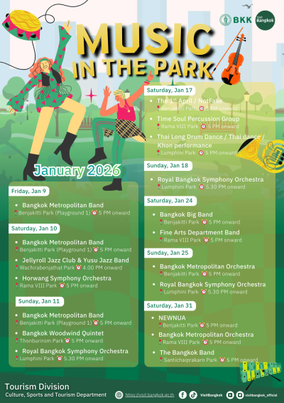 Bangkok Music In The Park는 방콕 전역의 공공 공원에서 열리는 야외 음악 행사로, 시민들이 녹지 공간에서 무료로 휴식하며 음악을 즐길 수 있도록 한다. 재즈, 클래식, 팝, 현대 음악 등 다양한 장르가 자연 속에서 어우러지며, 가족과 함께 휴식을 취하고 의미 있는 시간을 보내기에 적합하다. 음악을 통해 예술과 문화, 시민의 행복을 중시하는 방콕의 도시 이미지를 보여주며, 2026년 1월 9일부터 1월 31일까지 토-일 방콕에서 매주 개최되며 무료다. (Shutzaky, Bangkok)