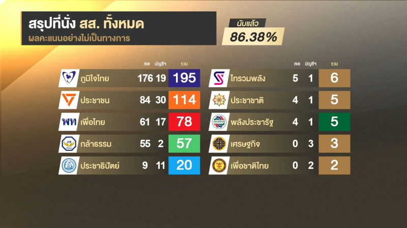 당초 개혁을 기치로 내건 국민당과 품짜이타이당의 선두 다툼이 예상됐으나, 선거 결과는 품짜이타이당이 확실한 우위를 보이며 일찌감치 최다 의석을 차지하는 것으로 나타났다.